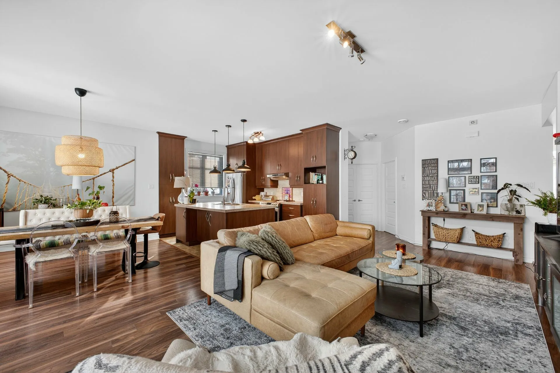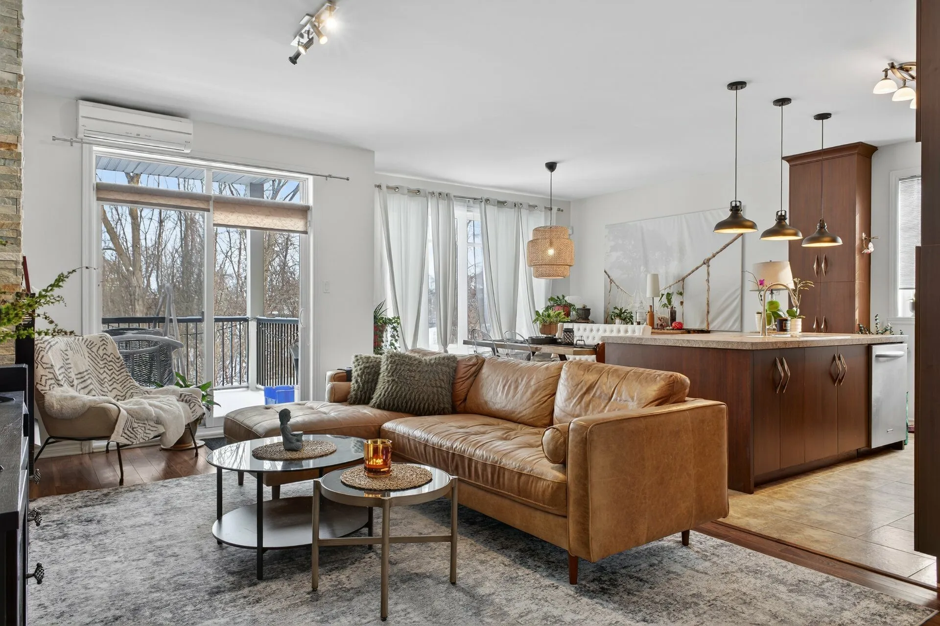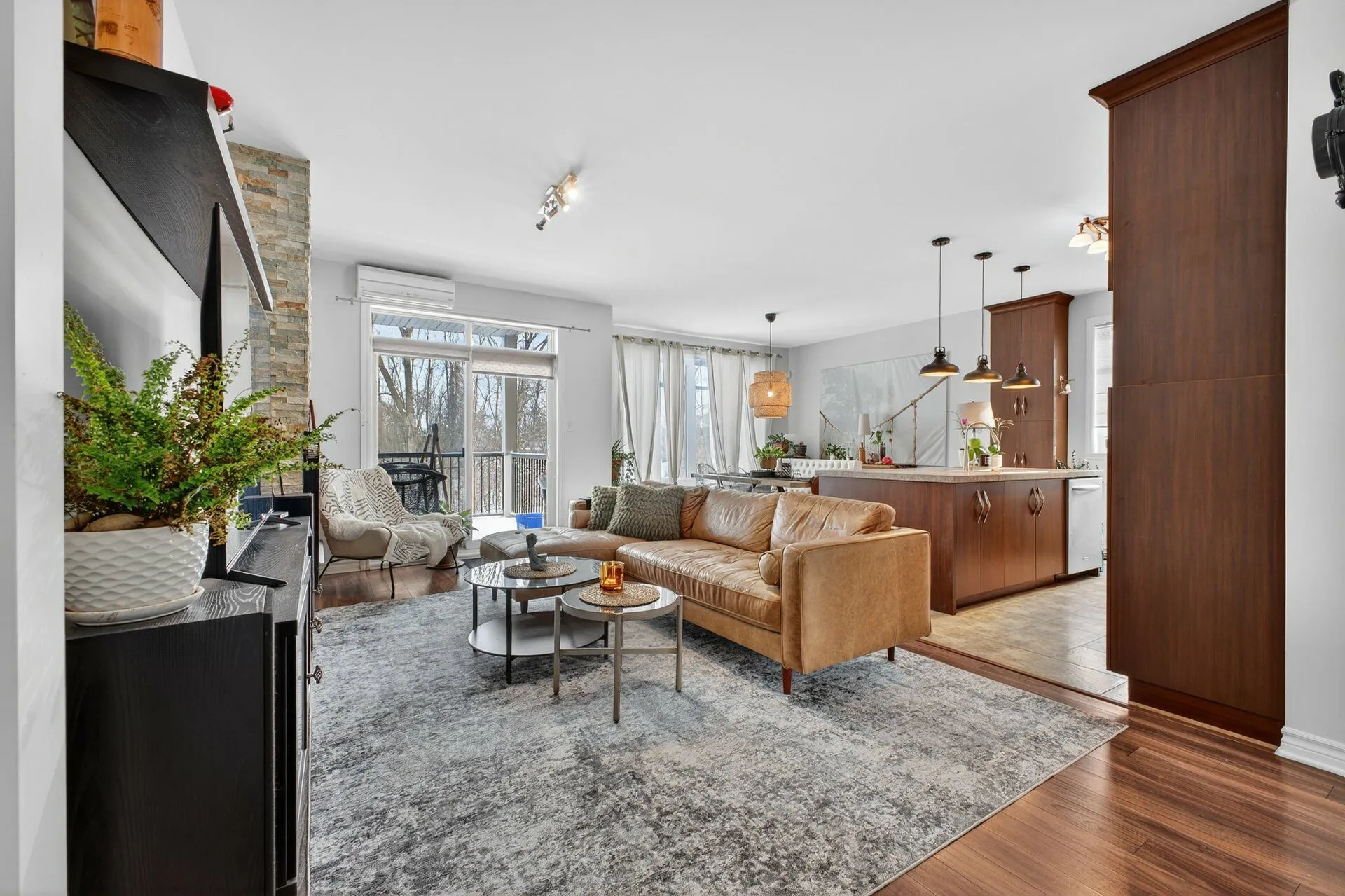 Beautiful modern open-concept condo located on a quiet, low-traffic street. Bright living area with large windows and a gas fireplace creating a warm atmosphere. Elegant and functional kitchen with ample storage, ceiling-height cabinets, and a large central island, ideal for entertaining family and friends. Two generously sized bedrooms, bathroom with a separate shower, private entrance, and two parking spaces. Large private balcony with no direct view of neighboring condos. Prime location close to services, shops, schools, and the Candiac train station. A must see!