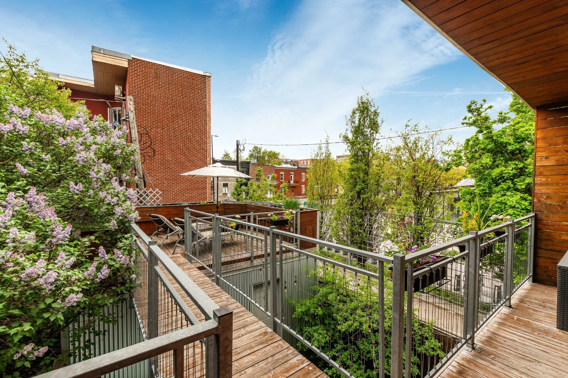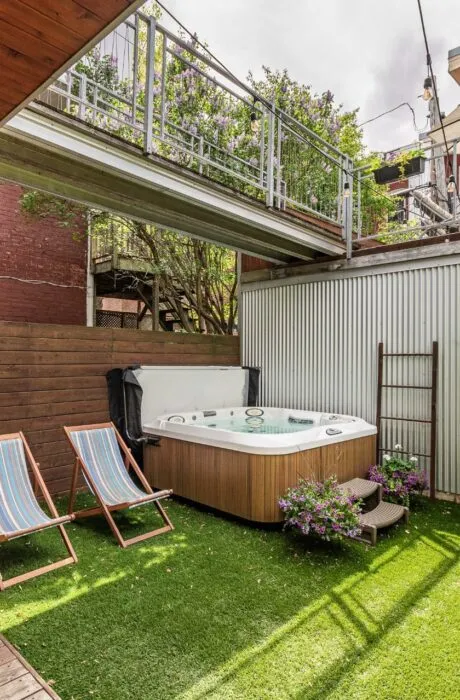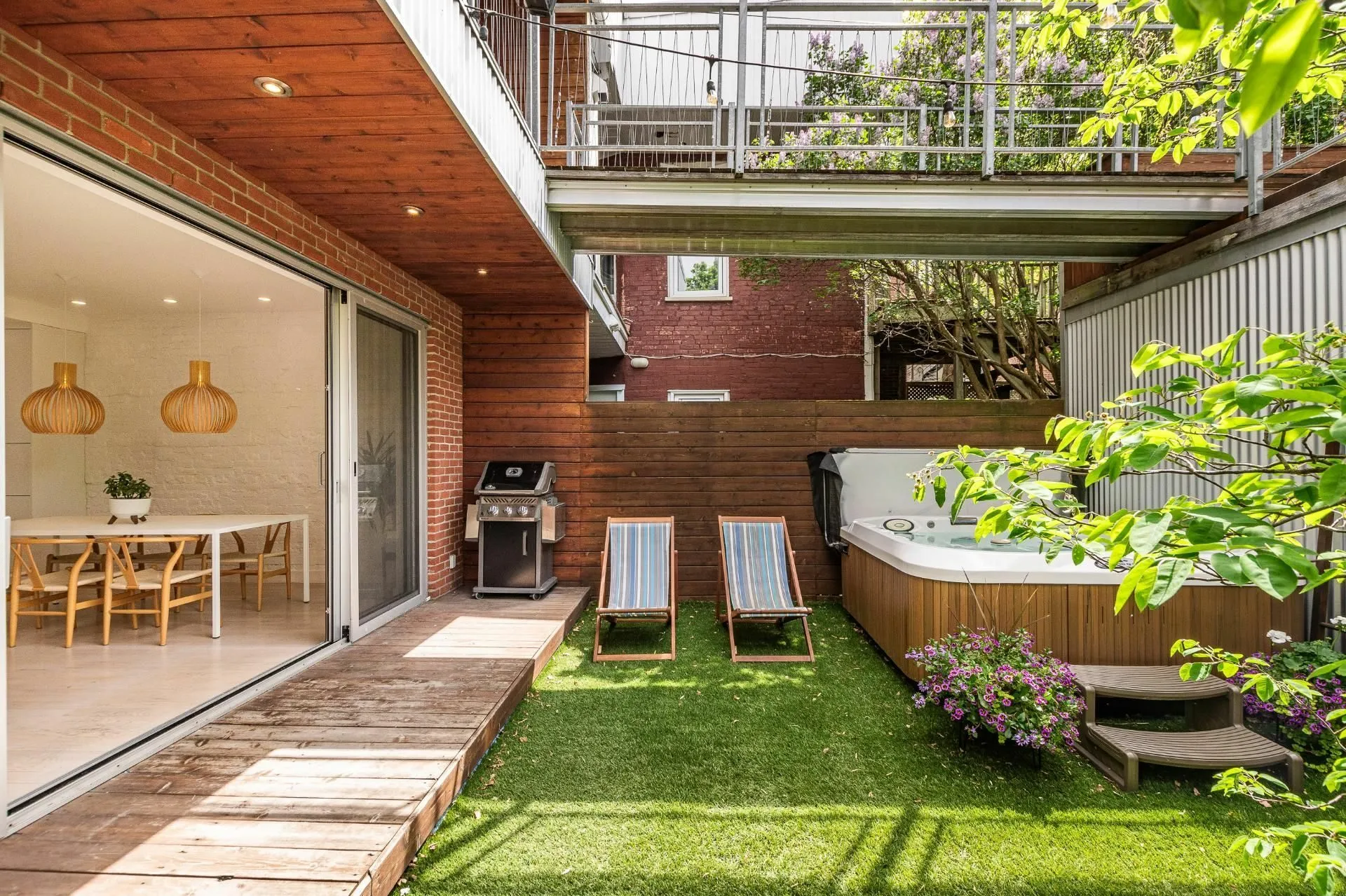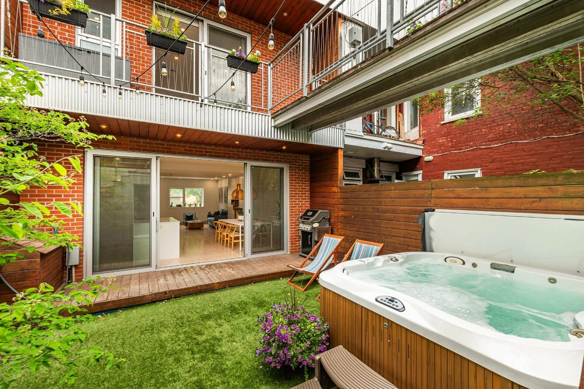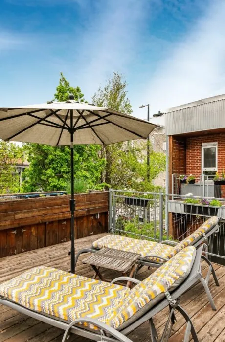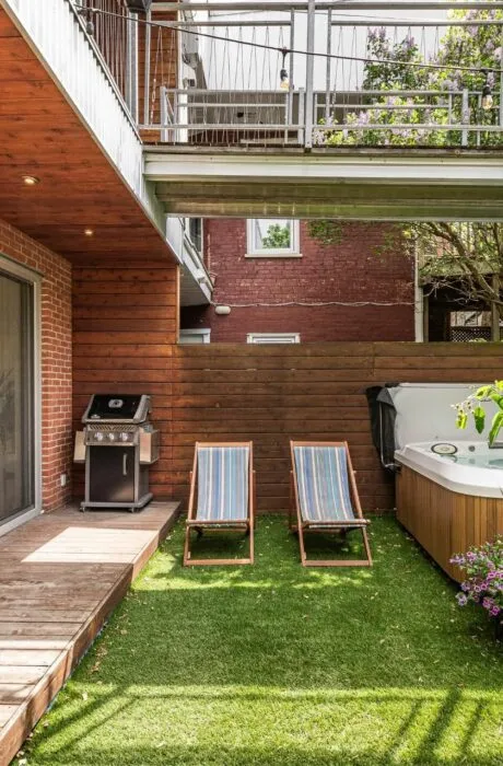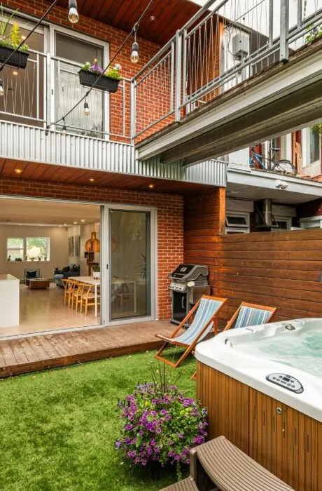PURE PLEASURE. Remarkable brightness - architectural window on the first floor opening onto the backyard. Open-plan living spaces, an elegant combination of brick walls and wood floors. 3 bedrooms upstairs, including a master suite with walk-in closet and adjoining terrace. Modern kitchen with central island. Plenty of storage space. 2 bathrooms with heated floors. Laundry room. A haven of tranquility in the heart of the Plateau: enjoy a west-facing grassy courtyard with jacuzzi, roof terrace and one-car garage. Close to the Mont-Royal metro station and the neighborhood's gourmet addresses.