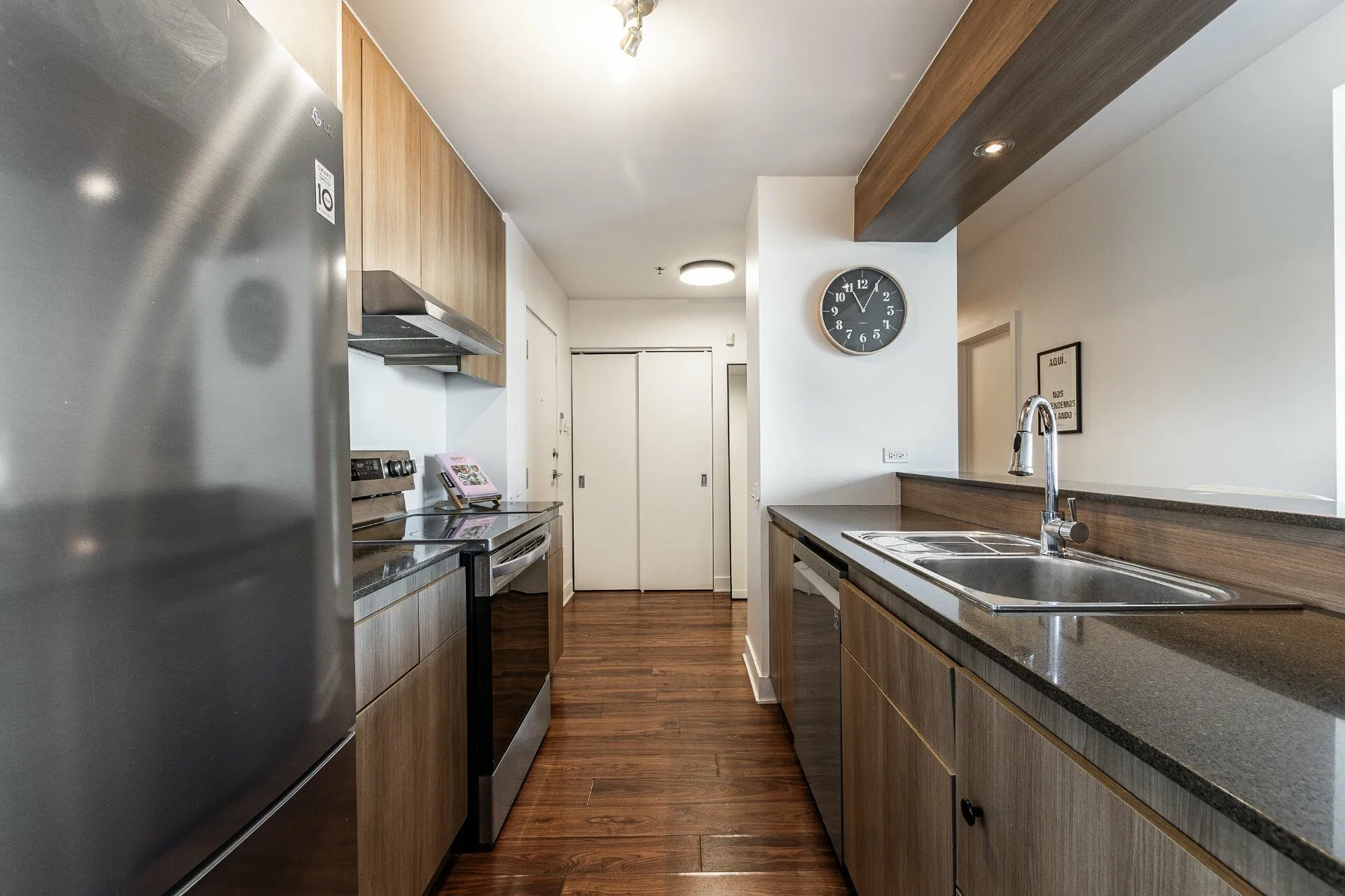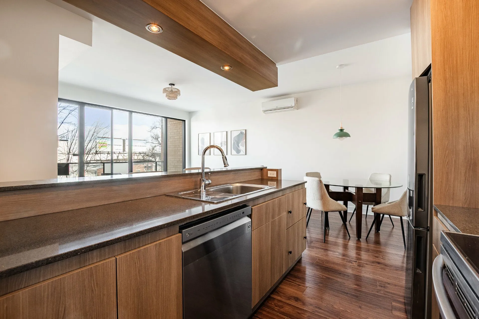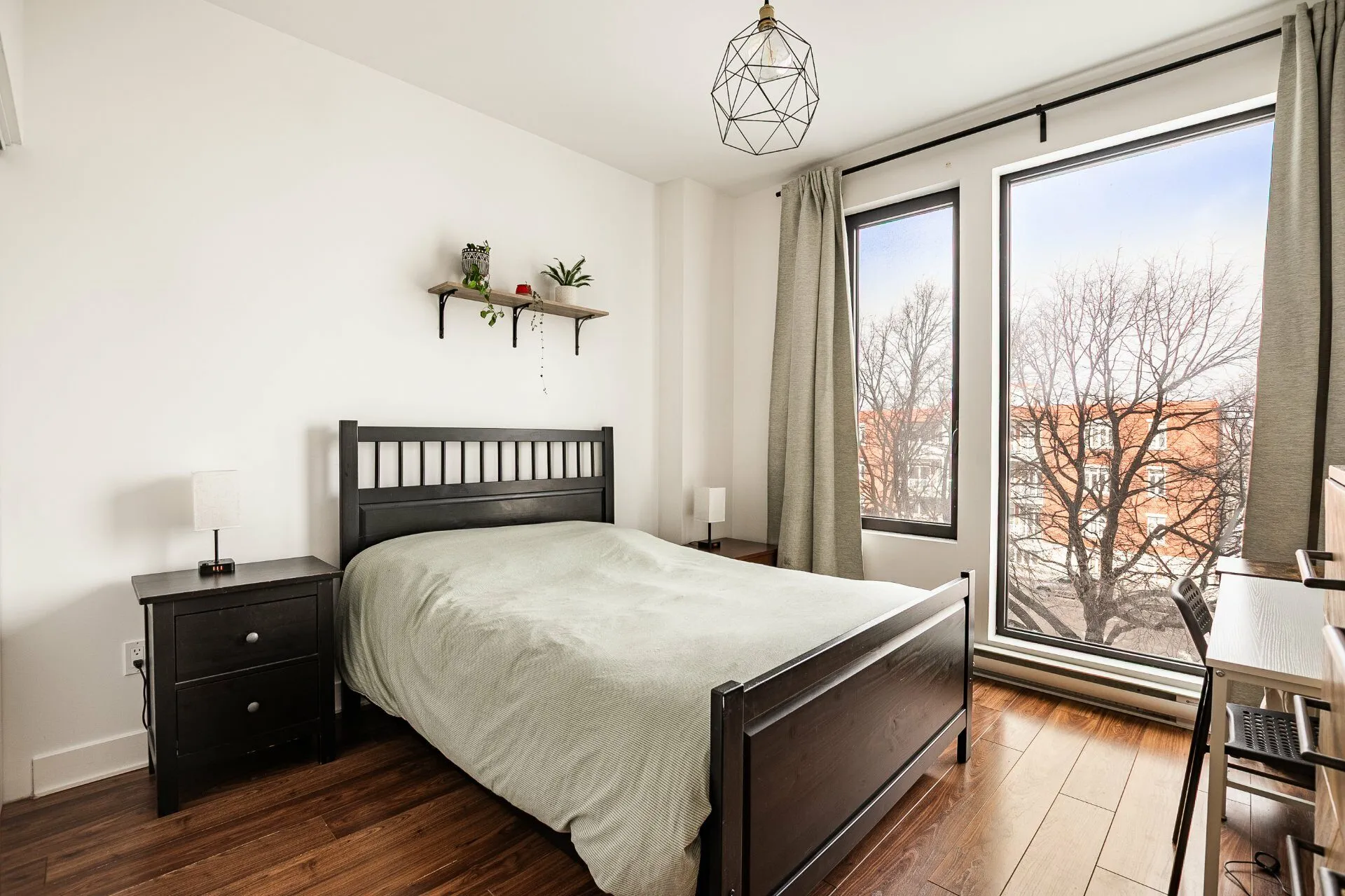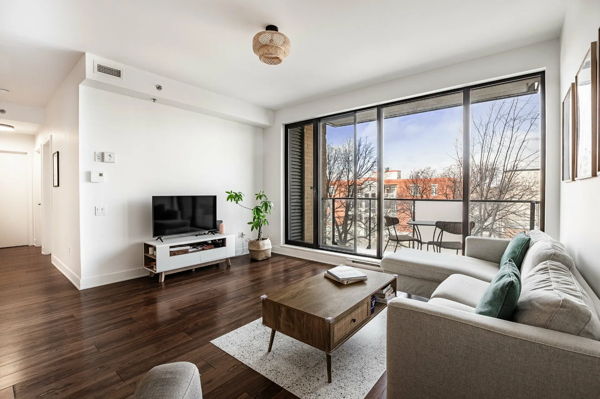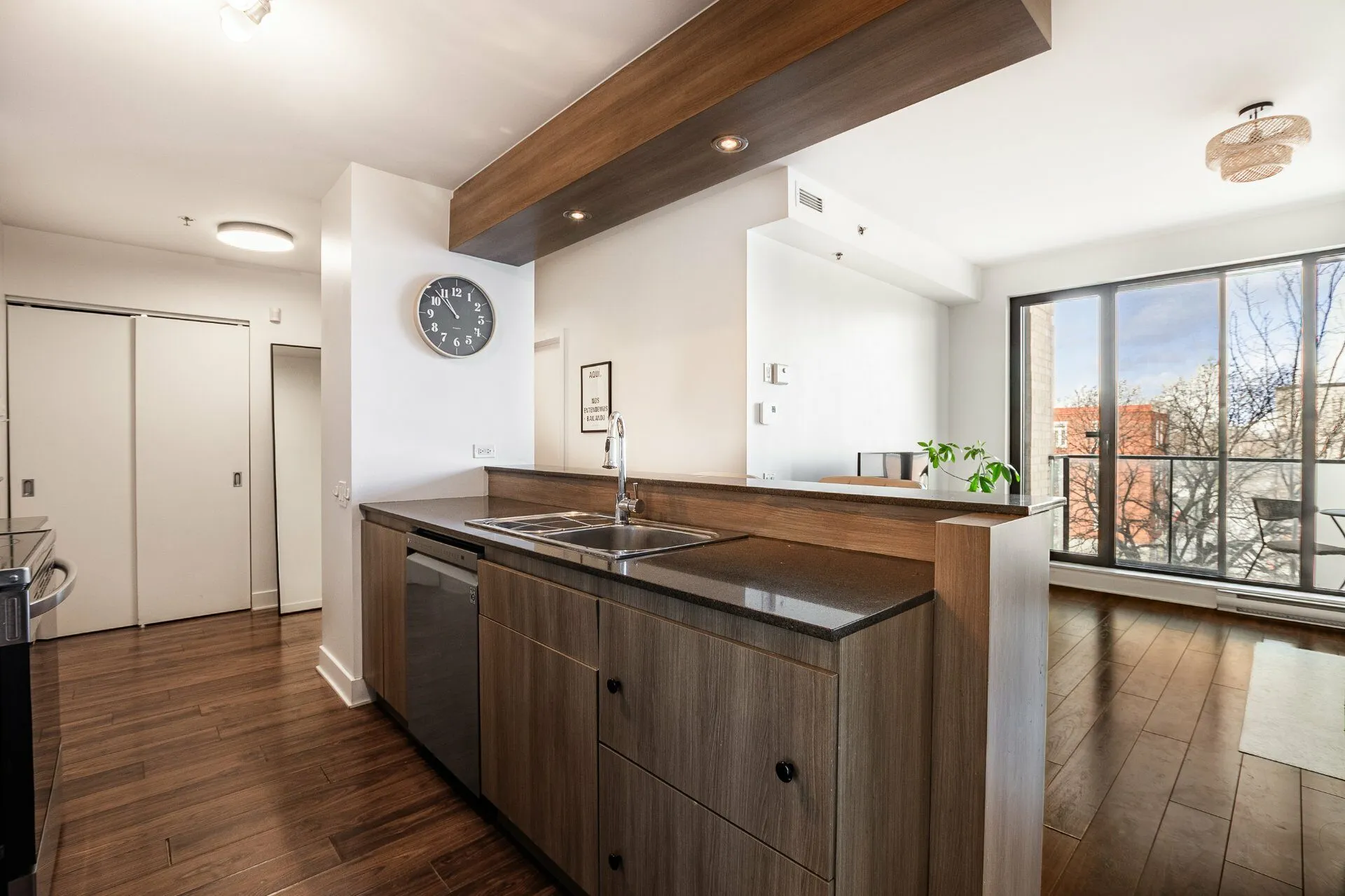 CONDO MODERNE ET LUMINEUX. Espace aire ouverte, 2 chambres à coucher. Grandes fenêtres architecturales. Plafonds de béton - insonorisation supérieure. Plancher de bois d'ingénierie. Salle de bain avec bain podium et douche vitrée indépendante. Ascenseur. Balcon privé. Espace de stationnement intérieur. Vaste terrasse commune sur le toit avec une vue imprenable sur la ville. Emplacement de choix: à deux pas du métro Rosemont, du parc Père-Marquette et des meilleures adresses du quartier. Bienvenue au Quartier 54.