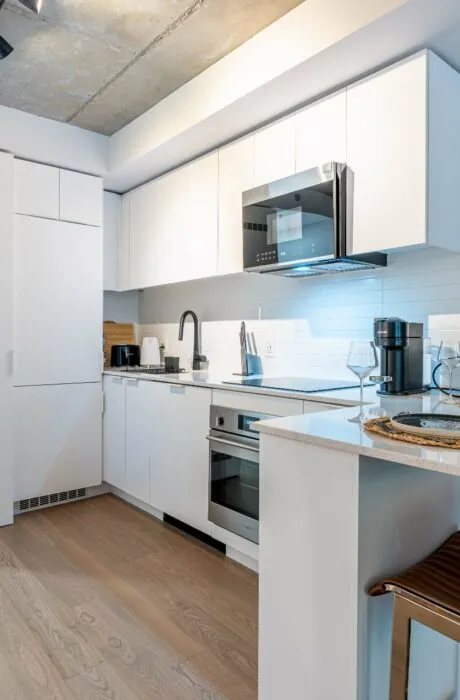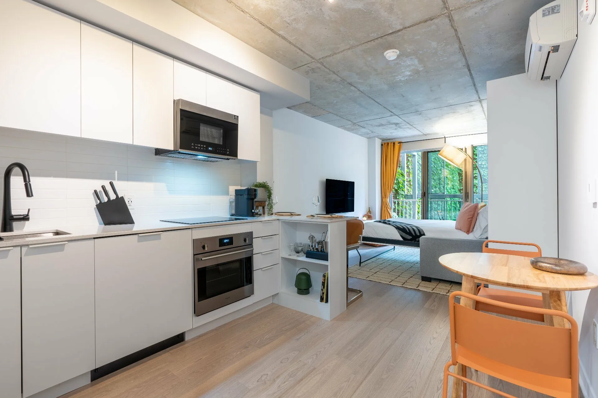 - Superbe studio situé au 4e étage du prestigieux projet Eli Condos.- Plancher de bois et plafond style industriel en béton- En plein coeur du Quartier des Spectacles.- Un lit escamotable.- Laveuse / sécheuse superposées - Un espace de rangement intérieur inclus